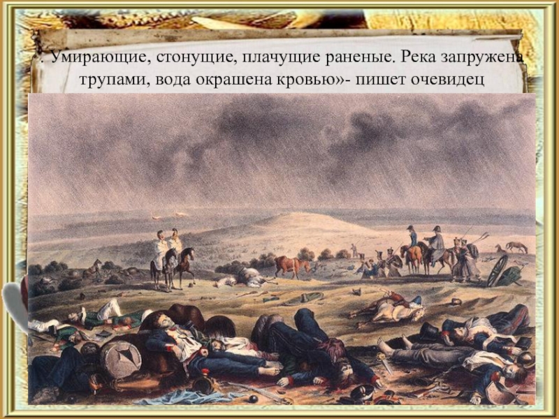 Слайд 22. Умирающие, стонущие, плачущие раненые. Река запружена трупами, вода окрашена кровью»-