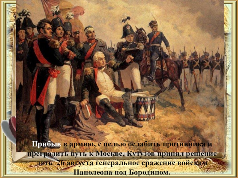 Слайд 26После Бородинского сражения русская армия отошла к Москве. Состоялся военный совет