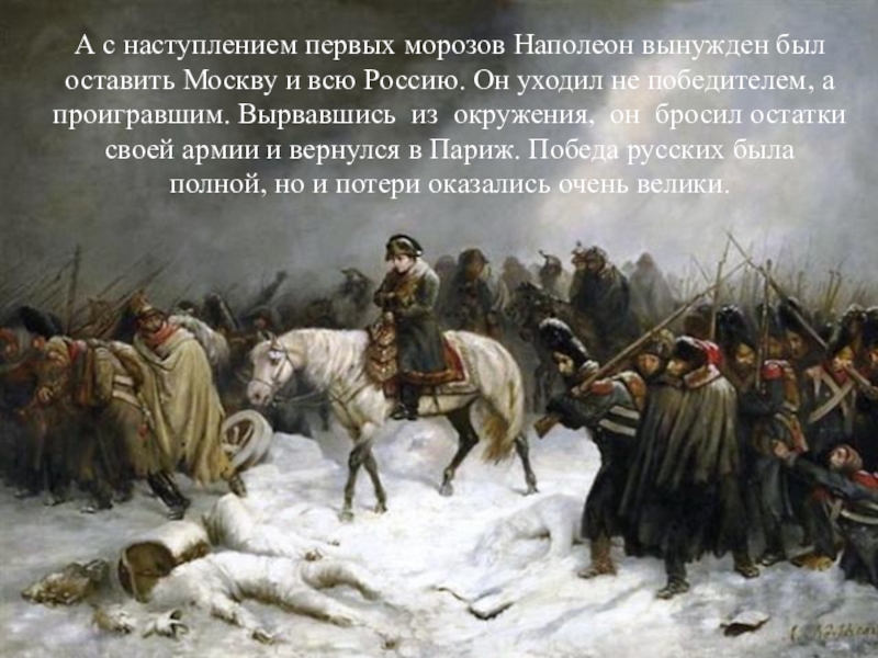 всю Россию. Он уходил не победителем, а проигравшим. Вырвавшись из окружения, он бросил остатки своей армии и вернулся в Париж. Победа русских была полной, но и потери оказались очень велики.