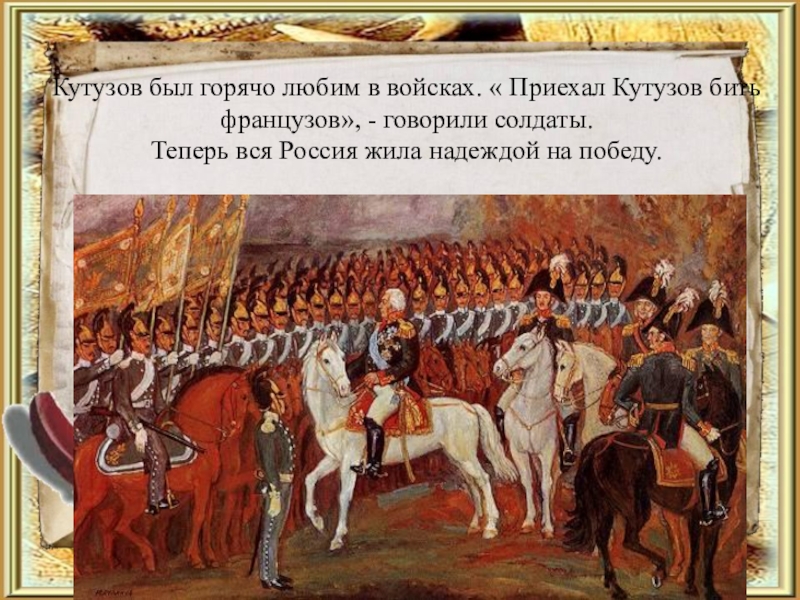 Слайд 11Кутузов был горячо любим в войсках. « Приехал Кутузов бить французов»,