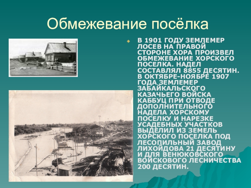 ОБМЕЖЕВАНИЕ ХОРСКОГО ПОСЕЛКА. НАДЕЛ СОСТАВЛЯЛ 8855 ДЕСЯТИН. В ОКТЯБРЕ-НОЯБРЕ 1907 ГОДА ЗЕМЛЕМЕР ЗАБАЙКАЛЬСКОГО КАЗАЧЬЕГО ВОЙСКА КАББУЦ ПРИ ОТВОДЕ ДОПОЛНИТЕЛЬНОГО НАДЕЛА ХОРСКОМУ ПОСЕЛКУ И НАРЕЗКЕ УСАДЕБНЫХ УЧАСТКОВ ВЫДЕЛИЛ ИЗ ЗЕМЕЛЬ ХОРСКОГО ПОСЕЛКА ПОД ЛЕСОПИЛЬНЫЙ ЗАВОД ЛИХОЙДОВА 21 ДЕСЯТИНУ И ДЛЯ ВЕНЮКОВСКОГО ВОЙСКОВОГО ЛЕСНИЧЕСТВА 200 ДЕСЯТИН.