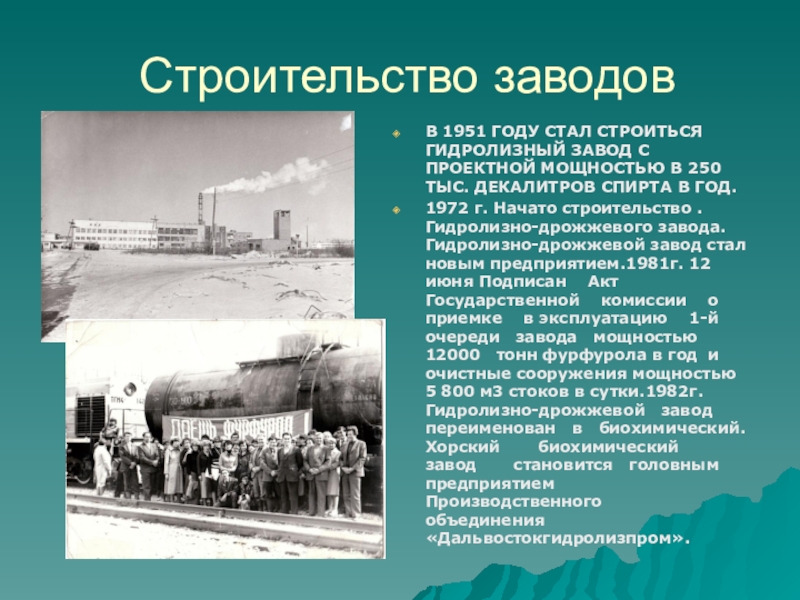 1972 г. Начато строительство . Гидролизно-дрожжевого завода. Гидролизно-дрожжевой завод стал новым предприятием.1981г. 12 июня Подписан Акт Государственной комиссии о приемке в эксплуатацию 1-й очереди завода мощностью 12000 тонн фурфурола в год и очистные сооружения мощностью 5 800 м3 стоков в сутки.1982г.Гидролизно-дрожжевой завод переименован в биохимический. Хорский биохимический завод становится головным предприятием Производственного объединения «Дальвостокгидролизпром».
