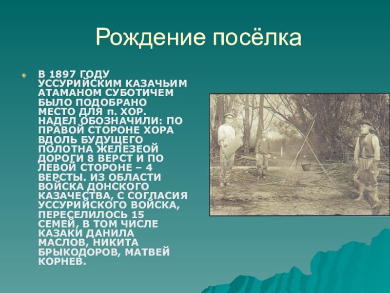ДЛЯ п. ХОР. НАДЕЛ ОБОЗНАЧИЛИ: ПО ПРАВОЙ СТОРОНЕ ХОРА ВДОЛЬ БУДУЩЕГО ПОЛОТНА ЖЕЛЕЗЕОЙ ДОРОГИ 8 ВЕРСТ И ПО ЛЕВОЙ СТОРОНЕ – 4 ВЕРСТЫ. ИЗ ОБЛАСТИ ВОЙСКА ДОНСКОГО КАЗАЧЕСТВА, С СОГЛАСИЯ УССУРИЙСКОГО ВОЙСКА, ПЕРЕСЕЛИЛОСЬ 15 СЕМЕЙ, В ТОМ ЧИСЛЕ КАЗАКИ ДАНИЛА МАСЛОВ, НИКИТА БРЫКОДОРОВ, МАТВЕЙ КОРНЕВ.