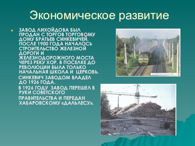 ПОСЛЕ 1900 ГОДА НАЧАЛОСЬ СТРОИТЕЛЬСТВО ЖЕЛЕЗНОЙ ДОРОГИ И ЖЕЛЕЗНОДОРОЖНОГО МОСТА ЧЕРЕЗ РЕКУ ХОР. В ПОСЕЛКЕ ДО РЕВОЛЮЦИИ БЫЛА ТОЛЬКО НАЧАЛЬНАЯ ШКОЛА И ЦЕРКОВЬ.