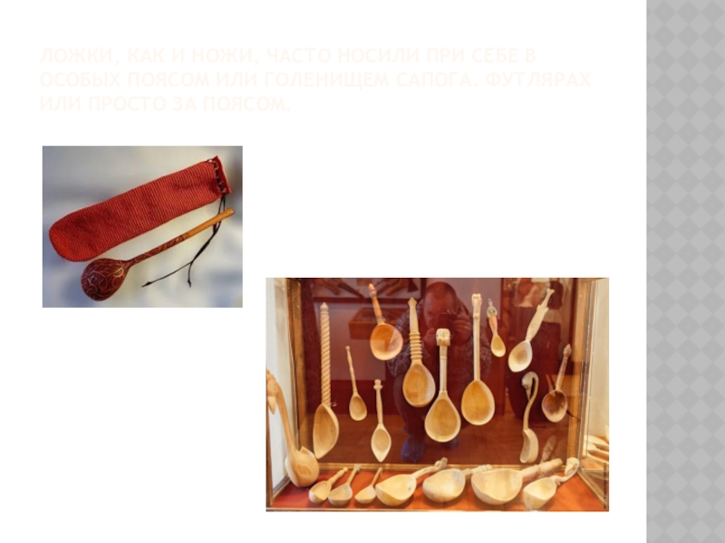 Слайд 7Ложки, как и ножи, часто носили при себе в особых поясом