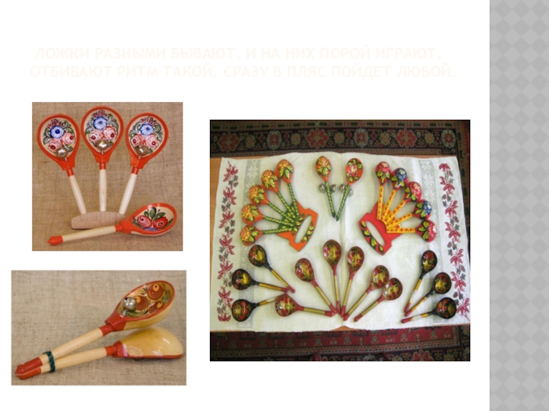 Слайд 10 Ложки разными бывают, И на них порой играют.  Отбивают ритм такой. Сразу в