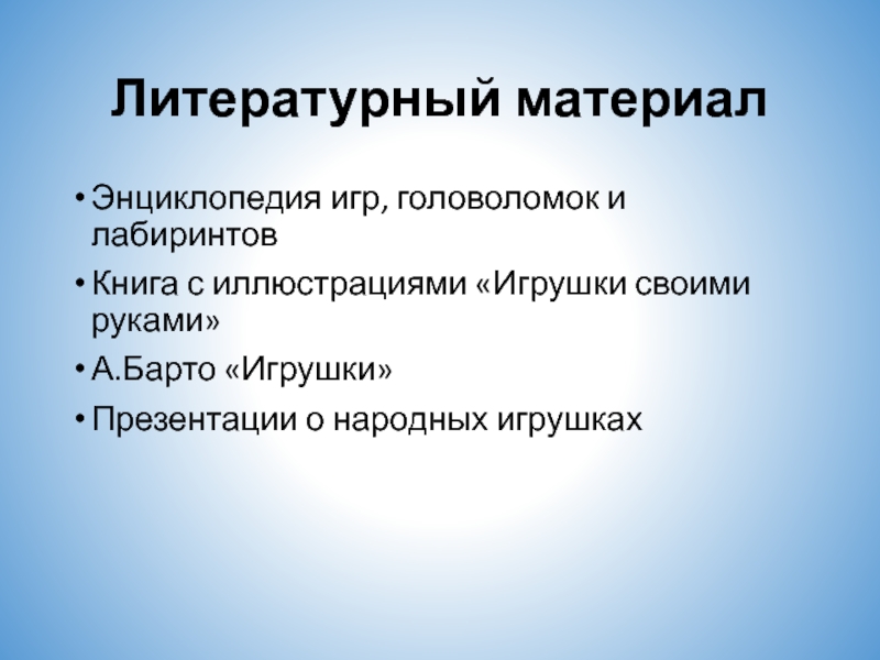 Литературный материалЭнциклопедия игр, головоломок и лабиринтовКнига с иллюстрациями «Игрушки своими руками»А.Барто «Игрушки»Презентации о народных игрушках