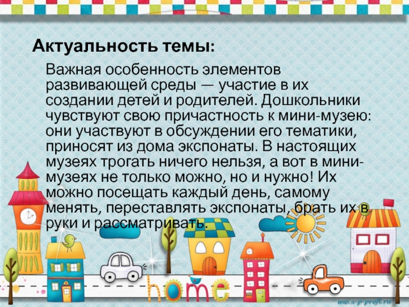 Актуальность темы:Важная особенность элементов развивающей среды — участие в их создании детей и родителей. Дошкольники чувствуют свою причастность к мини-музею: они участвуют в обсуждении его тематики, приносят из дома экспонаты. В настоящих музеях трогать ничего нельзя,