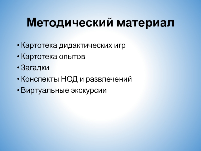 Методический материалКартотека дидактических игрКартотека опытовЗагадкиКонспекты НОД и развлеченийВиртуальные экскурсии