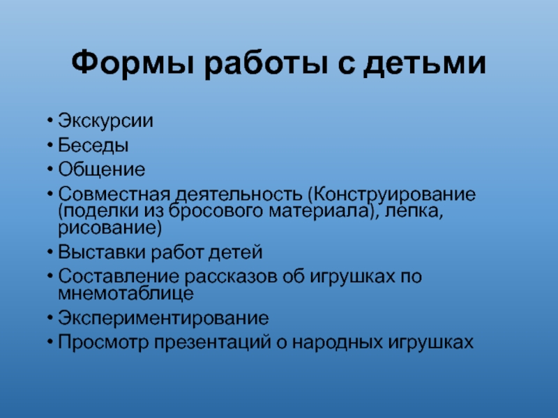 Формы работы с детьмиЭкскурсииБеседыОбщениеСовместная деятельность (Конструирование (поделки из бросового материала), лепка, рисование)Выставки работ детейСоставление рассказов об игрушках