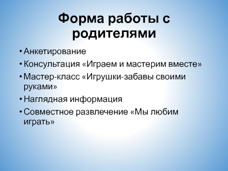 Форма работы с родителямиАнкетированиеКонсультация «Играем и мастерим вместе»Мастер-класс «Игрушки-забавы своими руками»Наглядная информацияСовместное развлечение «Мы любим играть»