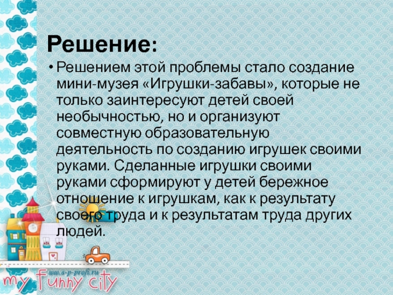 Решение: Решением этой проблемы стало создание мини-музея «Игрушки-забавы», которые не только заинтересуют детей своей необычностью, но и