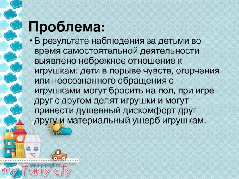 Проблема:В результате наблюдения за детьми во время самостоятельной деятельности выявлено небрежное отношение к игрушкам: дети в порыве