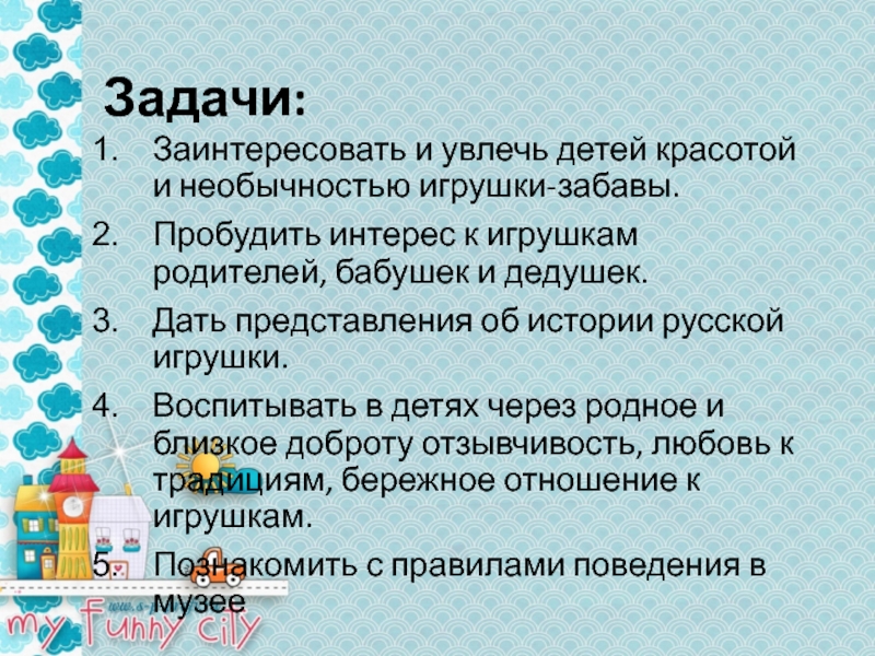 Задачи: Заинтересовать и увлечь детей красотой и необычностью игрушки-забавы. Пробудить интерес к игрушкам родителей, бабушек и дедушек.