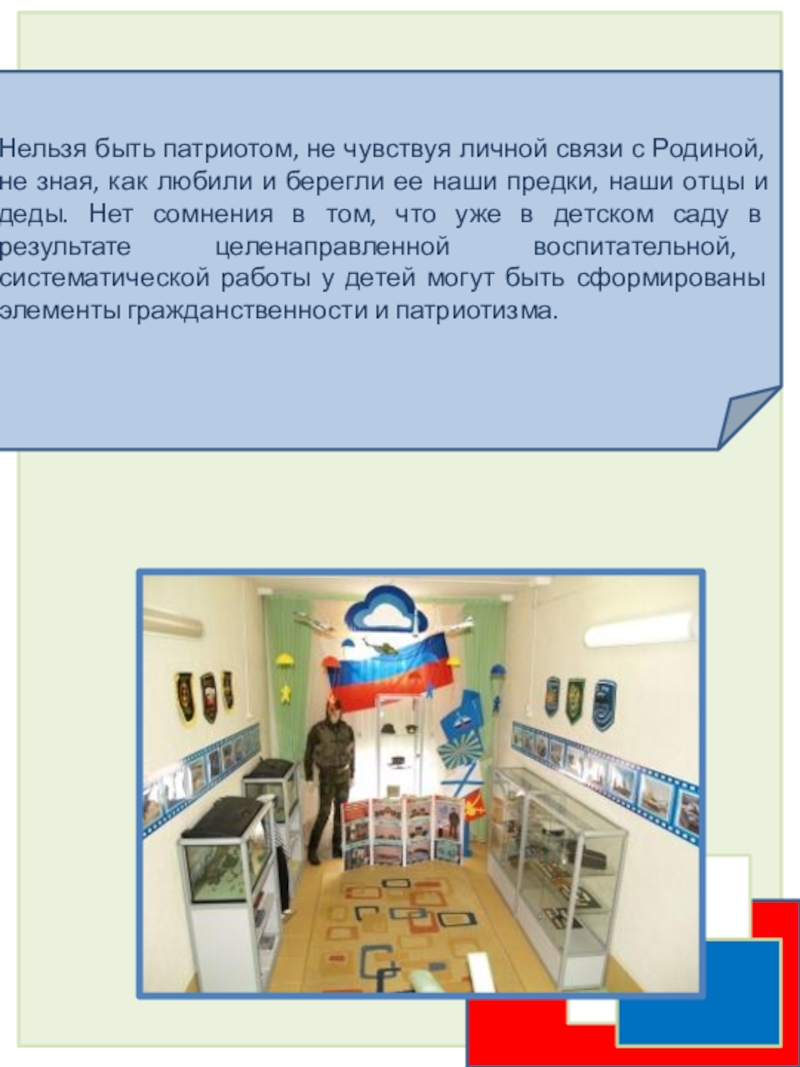 как любили и берегли ее наши предки, наши отцы и деды. Нет сомнения в том, что уже в детском саду в результате целенаправленной воспитательной, систематической работы у детей могут быть сформированы элементы гражданственности и патриотизма.