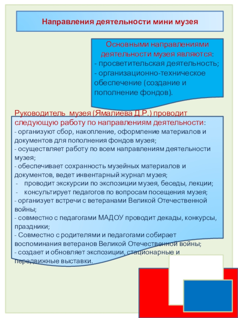 Руководитель музея (Ямалиева Д.Р.) проводит следующую работу по направлениям деятельности: