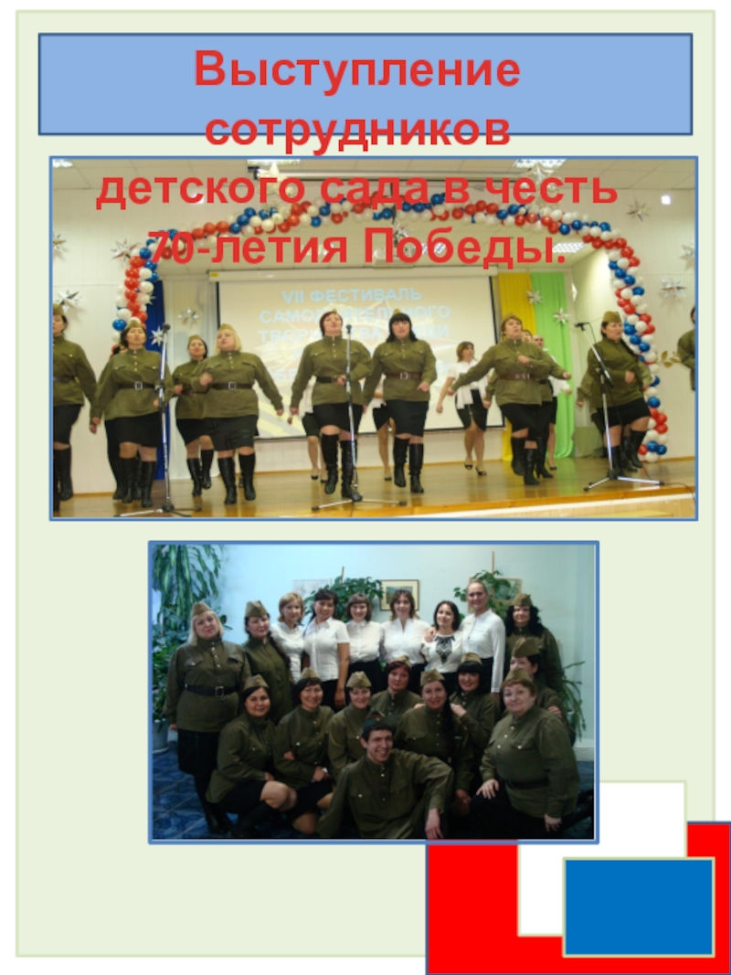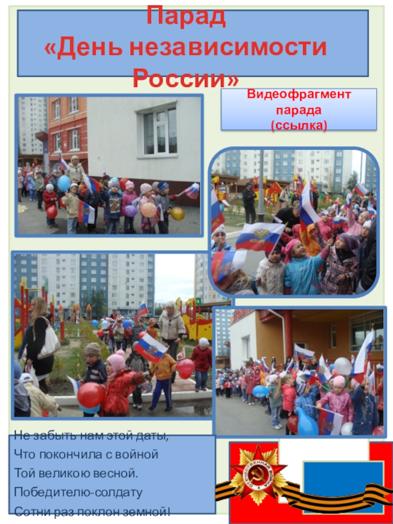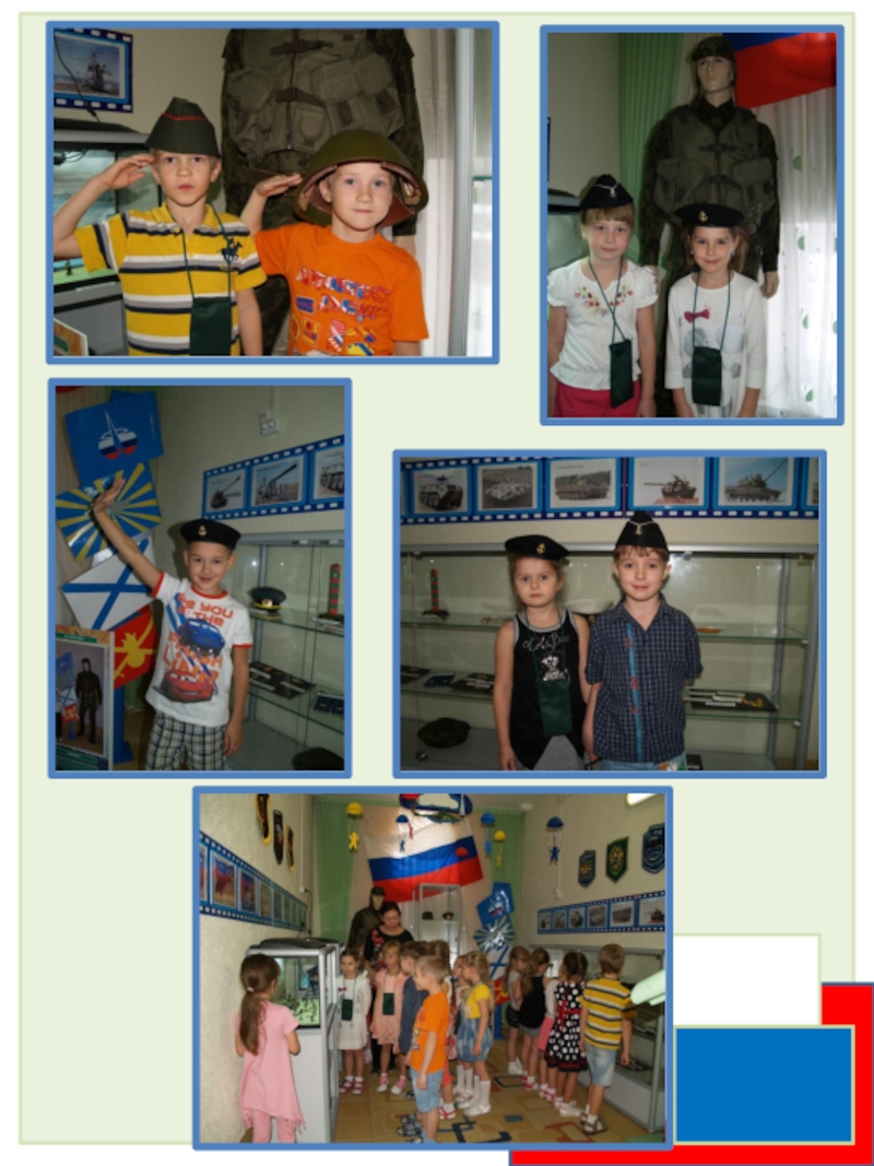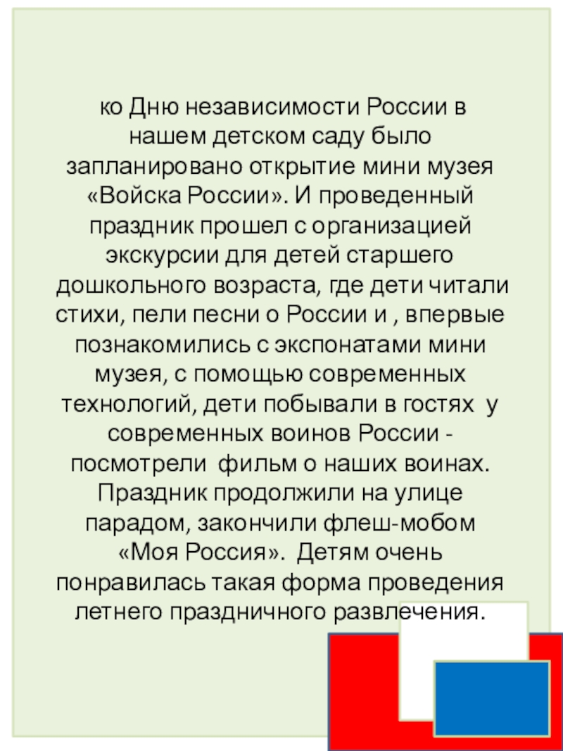 мини музея «Войска России». И проведенный праздник прошел с организацией экскурсии для детей старшего дошкольного возраста, где дети читали стихи, пели песни о России и , впервые познакомились с экспонатами мини музея, с помощью современных технологий, дети побывали в гостях у современных воинов России - посмотрели фильм о наших воинах. Праздник продолжили на улице парадом, закончили флеш-мобом «Моя Россия». Детям очень понравилась такая форма проведения летнего праздничного развлечения.