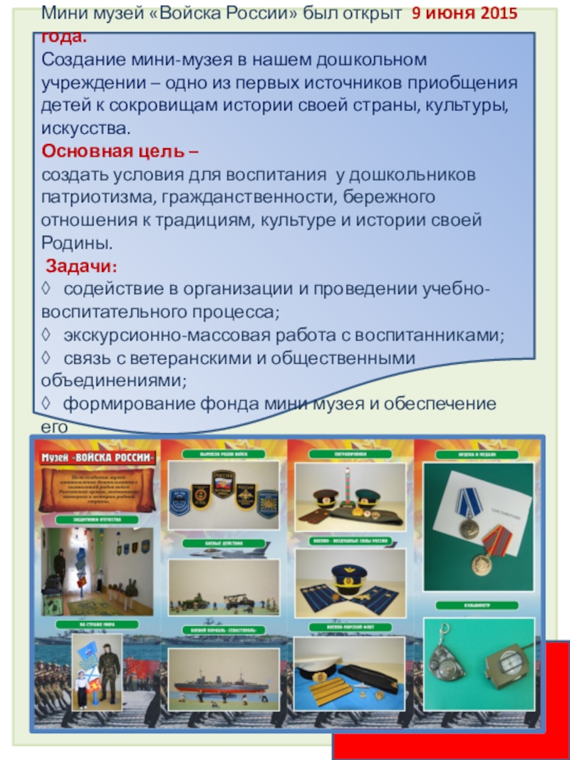 Мини музей «Войска России» был открыт 9 июня 2015 года.