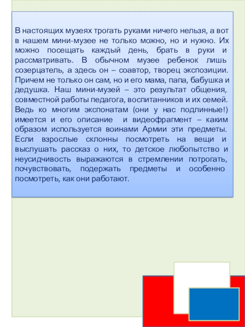 мини-музее не только можно, но и нужно. Их можно посещать каждый день, брать в руки и рассматривать. В обычном музее ребенок лишь созерцатель, а здесь он – соавтор, творец экспозиции. Причем не только он сам, но и его мама, папа, бабушка и дедушка. Наш мини-музей – это результат общения, совместной работы педагога, воспитанников и их семей.
