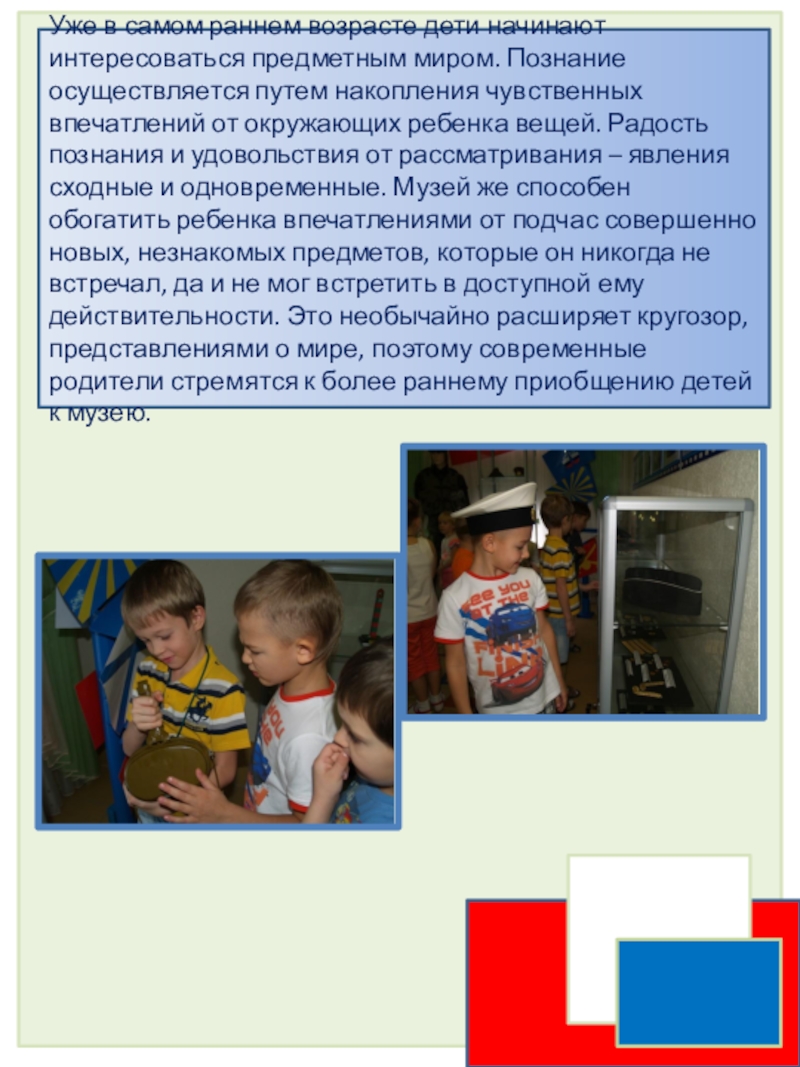 осуществляется путем накопления чувственных впечатлений от окружающих ребенка вещей. Радость познания и удовольствия от рассматривания – явления сходные и одновременные. Музей же способен обогатить ребенка впечатлениями от подчас совершенно новых, незнакомых предметов, которые он никогда не встречал, да и не мог встретить в доступной ему действительности. Это необычайно расширяет кругозор, представлениями о мире, поэтому современные родители стремятся к более раннему приобщению детей к музею.
