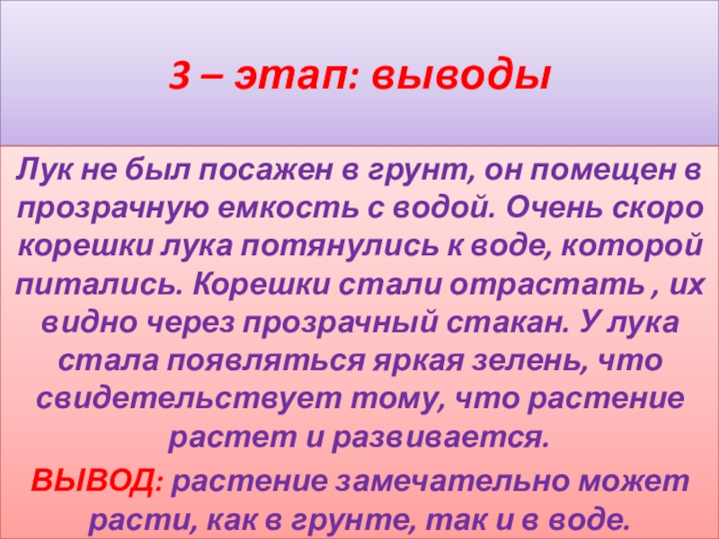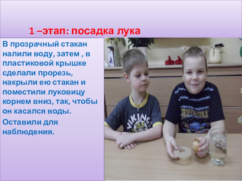 В прозрачный стакан налили воду, затем , в пластиковой крышке сделали прорезь, накрыли ею стакан и поместили луковицу корнем вниз, так, чтобы он касался воды.