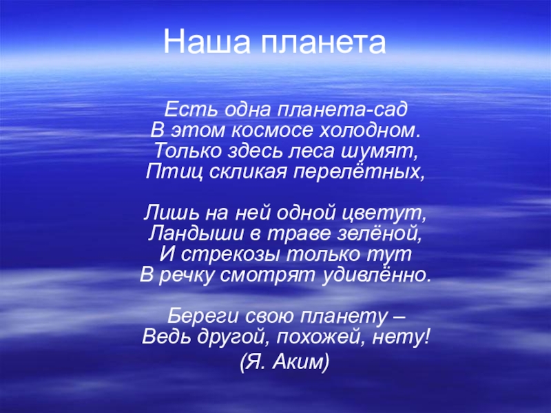 Наша планета    Есть одна планета-сад В этом космосе холодном. Только здесь леса шумят, Птиц скликая