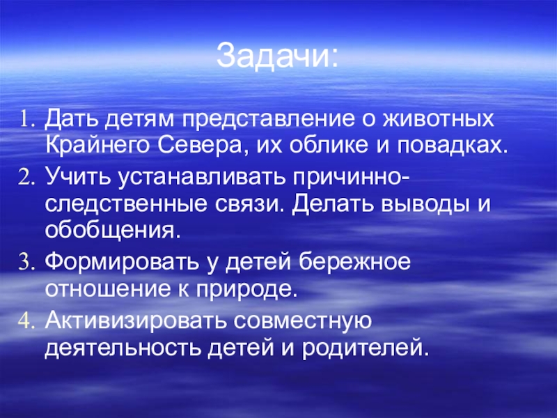 Задачи:Дать детям представление о животных Крайнего Севера, их облике и повадках.Учить устанавливать причинно-следственные связи. Делать выводы и