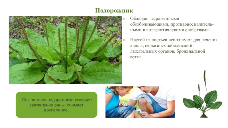 Сок листьев подорожника ускоряет заживление раны, снимает воспаление.