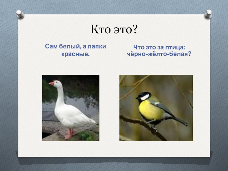Кто это?Сам белый, а лапки красные.Что это за птица: чёрно-жёлто-белая?