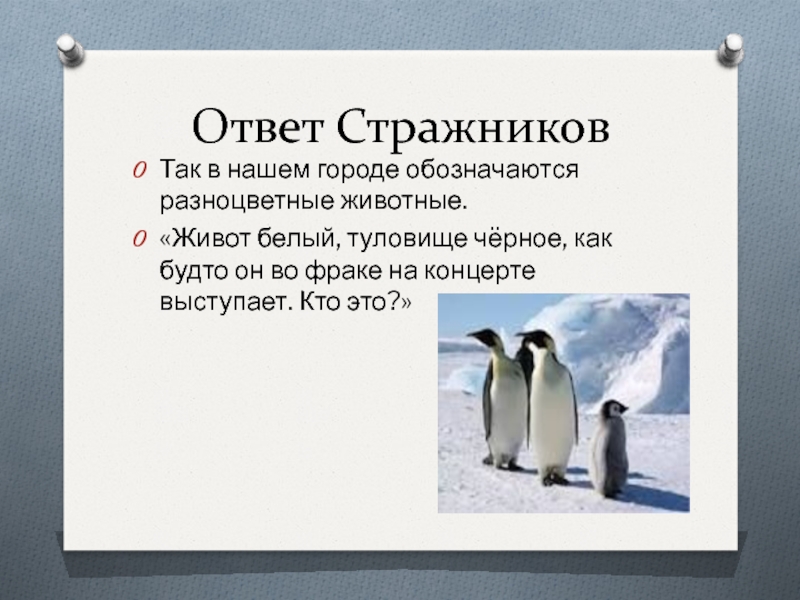 Ответ СтражниковТак в нашем городе обозначаются разноцветные животные.«Живот белый, туловище чёрное, как будто он во фраке на