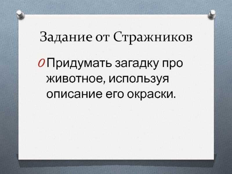Задание от СтражниковПридумать загадку про животное, используя описание его окраски.