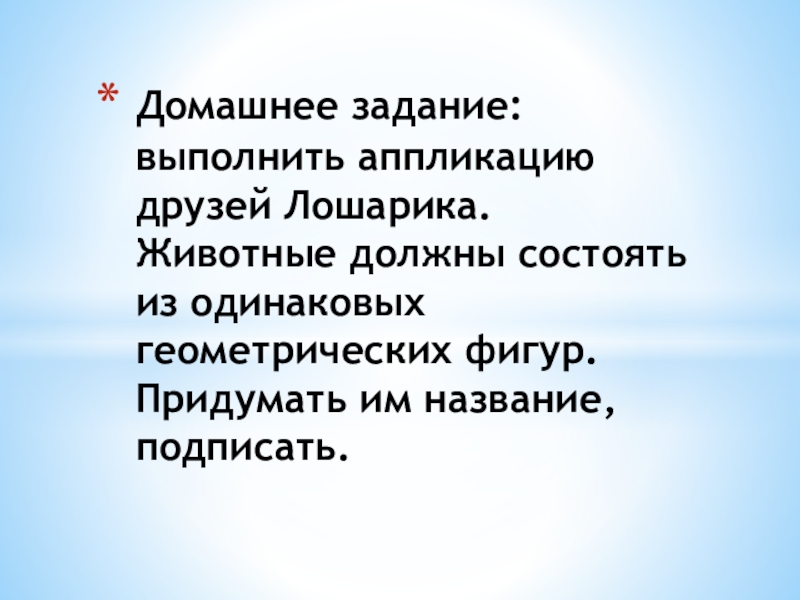Слайд 7Домашнее задание: выполнить аппликацию друзей Лошарика. Животные должны состоять из одинаковых геометрических