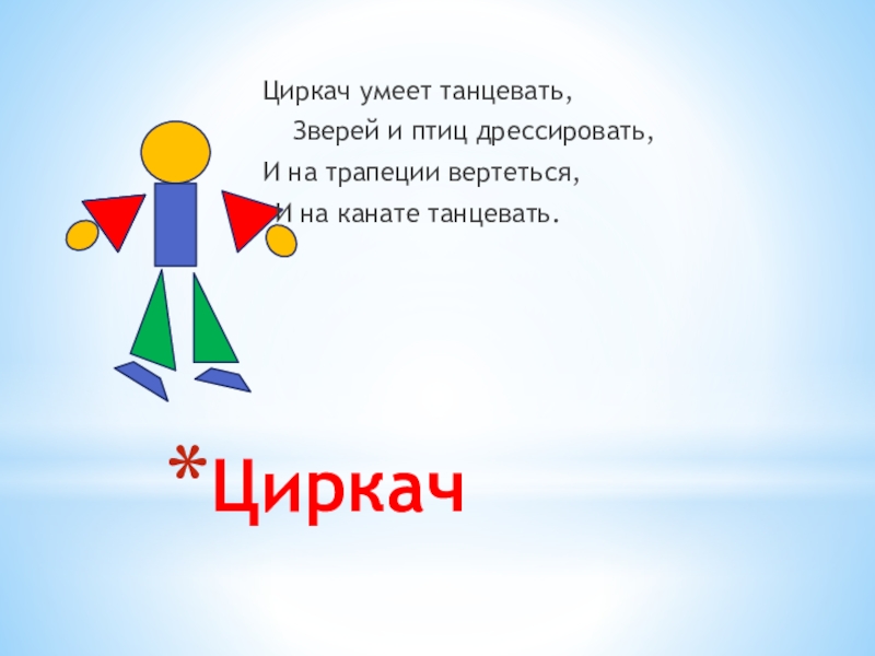 ЦиркачЦиркач умеет танцевать,       Зверей и птиц дрессировать, И на трапеции вертеться,И