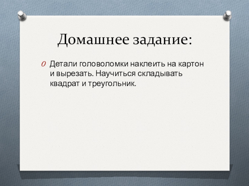 Домашнее задание:Детали головоломки наклеить на картон и вырезать. Научиться складывать квадрат и треугольник.