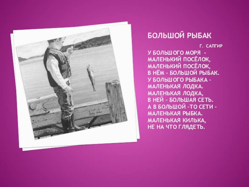 Г. Сапгир У большого моря - Маленький посёлок, Маленький посёлок, В нём – Большой Рыбак. У Большого Рыбака – Маленькая лодка. Маленькая лодка, В ней – большая сеть. А в большой –то сети – Маленькая рыбка. Маленькая килька, Не на что глядеть.