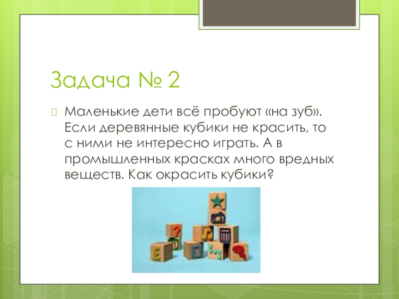 Задача № 2Маленькие дети всё пробуют «на зуб». Если деревянные кубики не красить, то с ними не