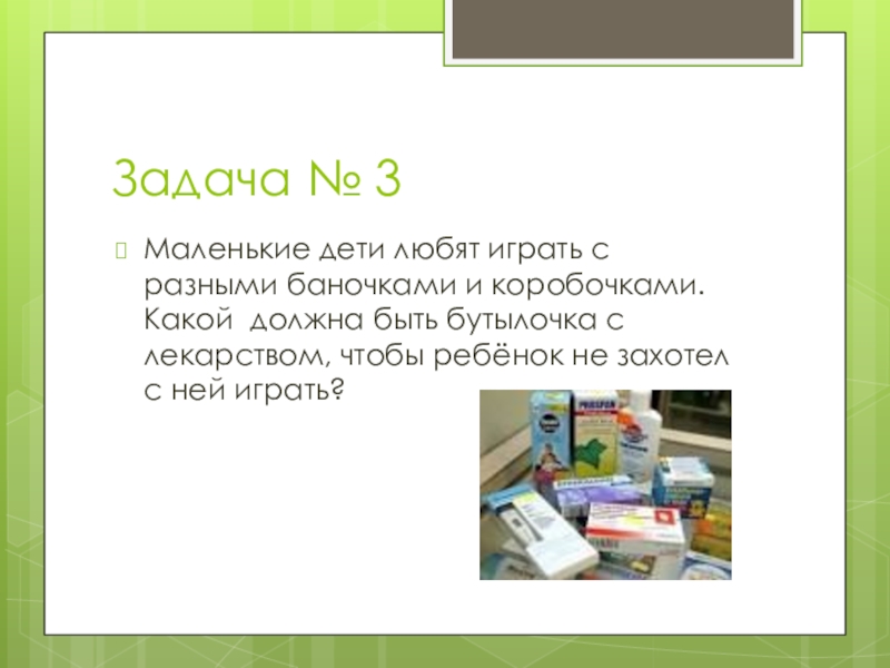 Задача № 3Маленькие дети любят играть с разными баночками и коробочками. Какой должна быть бутылочка с лекарством,