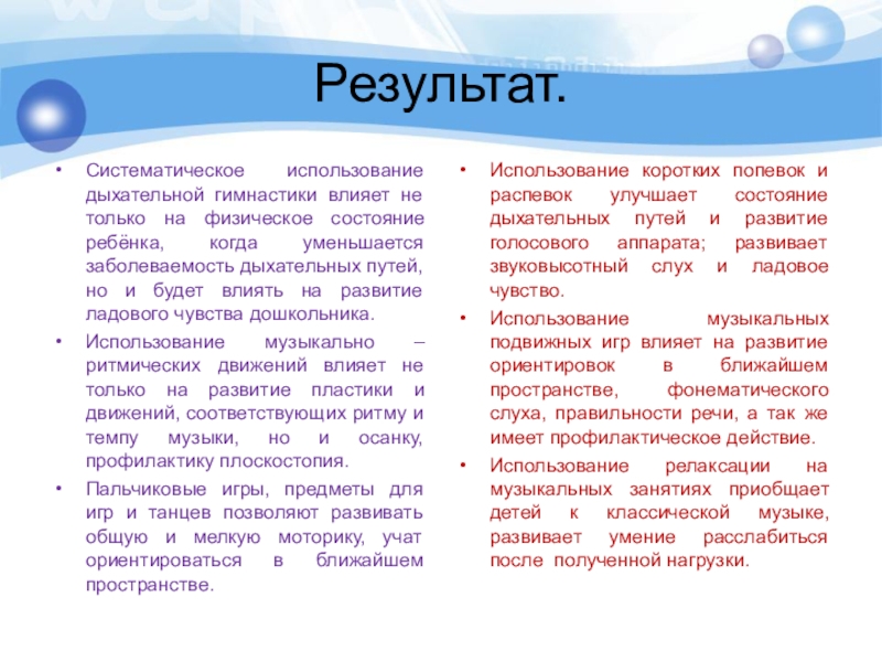Использование коротких попевок и распевок улучшает состояние дыхательных путей и развитие голосового аппарата; развивает звуковысотный слух и ладовое чувство.