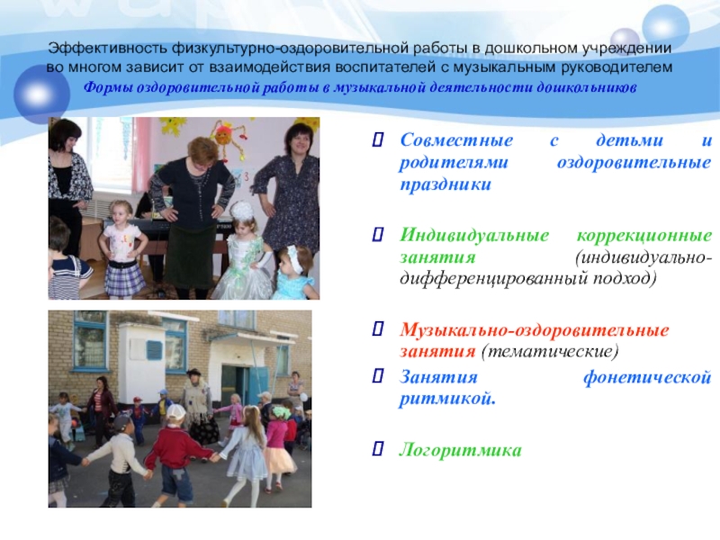 Использование музыкальных подвижных игр влияет на развитие ориентировок в ближайшем пространстве, фонематического слуха, правильности речи, а так же имеет профилактическое действие.
