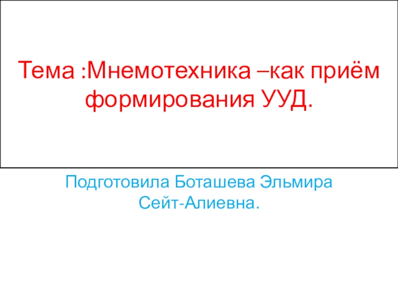 Тема :Мнемотехника –как приём формирования УУД.Подготовила Боташева Эльмира Сейт-Алиевна.