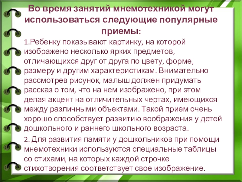 Во время занятий мнемотехникой могут использоваться следующие популярные приемы:
