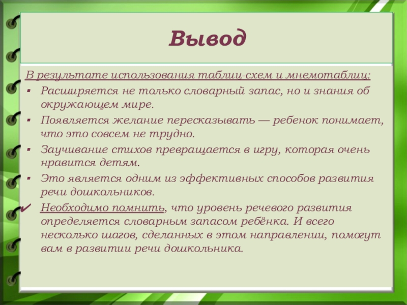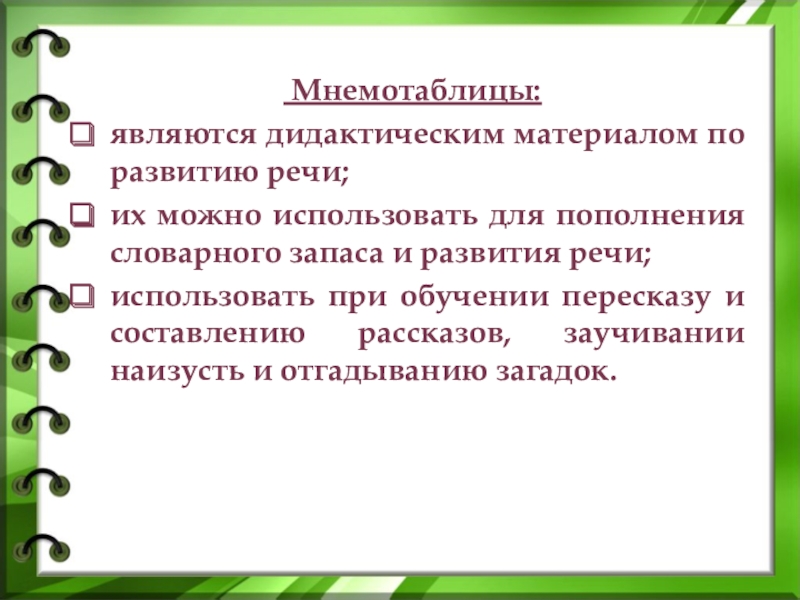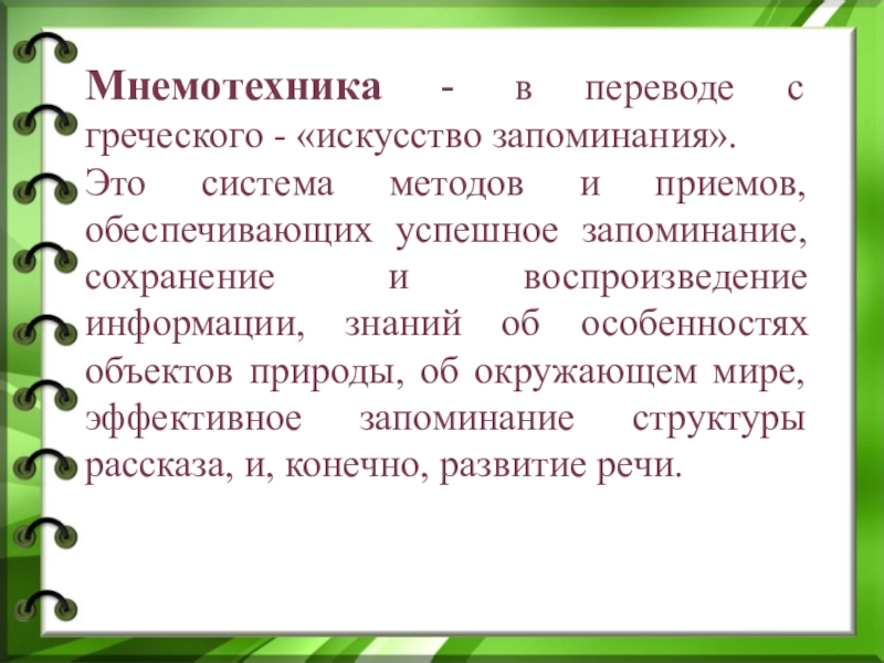 система методов и приемов, обеспечивающих успешное запоминание, сохранение и воспроизведение информации, знаний об особенностях объектов природы, об окружающем мире, эффективное запоминание структуры рассказа, и, конечно, развитие речи.