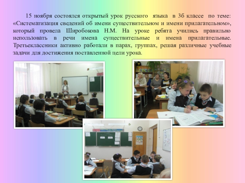 3б классе по теме: «Систематизация сведений об имени существительном и имени прилагательном», который провела Широбокова Н.М. На уроке ребята учились правильно использовать в речи имена существительные и имена прилагательные. Третьеклассники активно работали в парах, группах, решая различные учебные задачи для достижения поставленной цели урока.