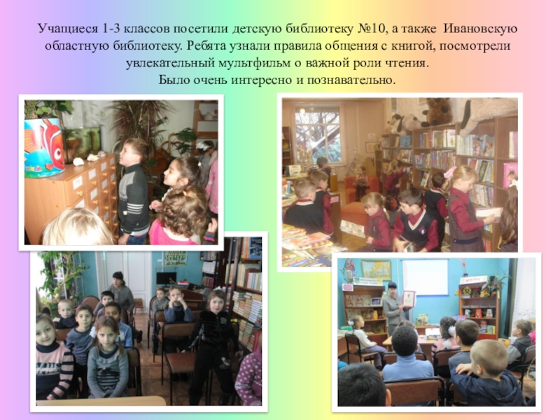 Слайд 15Учащиеся 1-3 классов посетили детскую библиотеку №10, а также Ивановскую областную