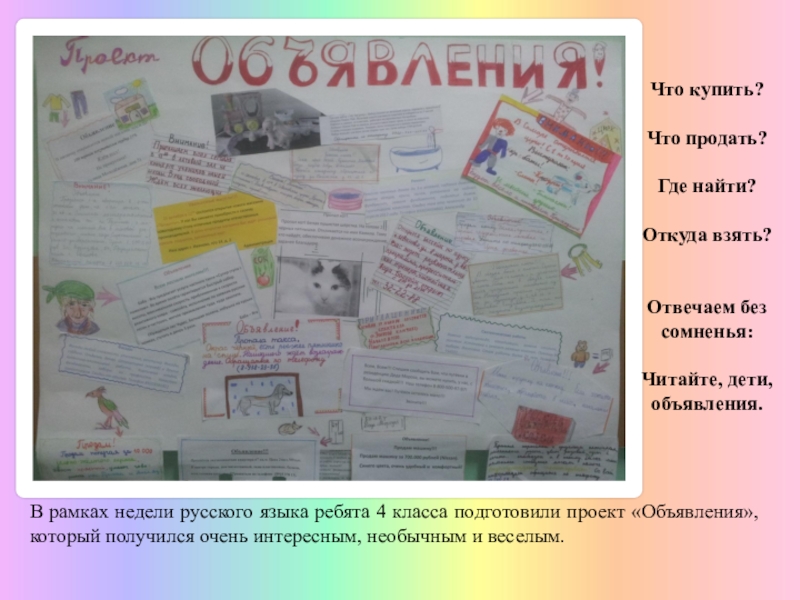 русского языка ребята 4 класса подготовили проект «Объявления», который получился очень интересным, необычным и веселым.