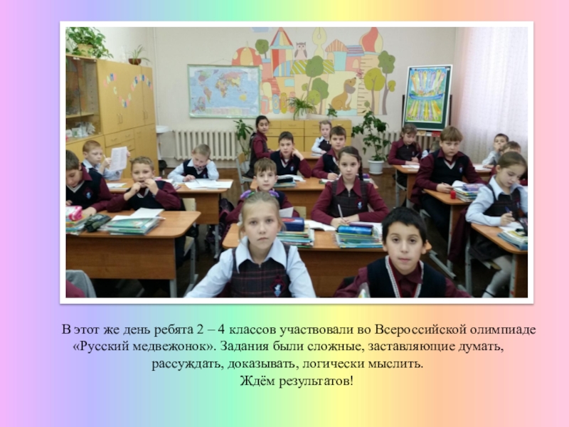 классов участвовали во Всероссийской олимпиаде «Русский медвежонок». Задания были сложные, заставляющие думать, рассуждать, доказывать, логически мыслить.