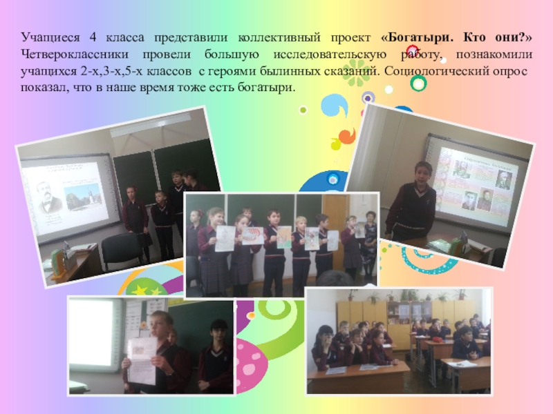 Слайд 8Учащиеся 4 класса представили коллективный проект «Богатыри. Кто они?» Четвероклассники провели