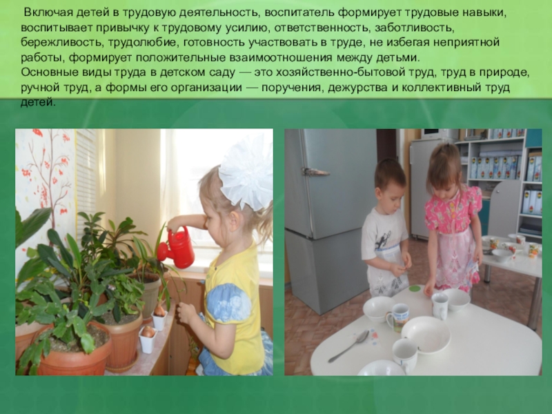 Слайд 12 Включая детей в трудовую деятельность, воспитатель формирует трудовые навыки, воспитывает