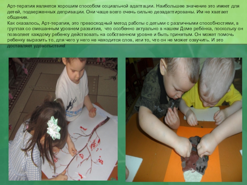 Слайд 27Арт-терапия является хорошим способом социальной адаптации. Наибольшее значение это имеет для