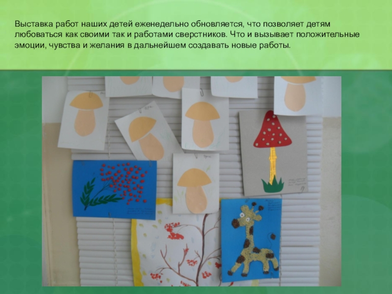 Слайд 29Выставка работ наших детей еженедельно обновляется, что позволяет детям любоваться как